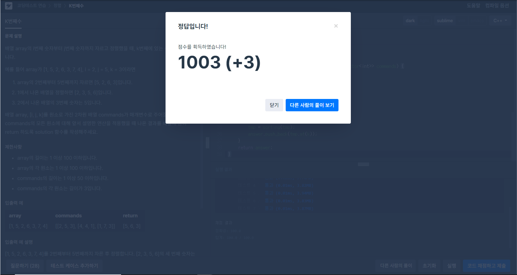 ● 기존에 제시되는 solution(vector<int> array, vector<vector<int>> commands) 함수에 코드 추가