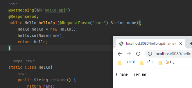 - @ResponseBody 를 사용하면 HTTP Body 데이터를 직접 넣어주겠다는 의미