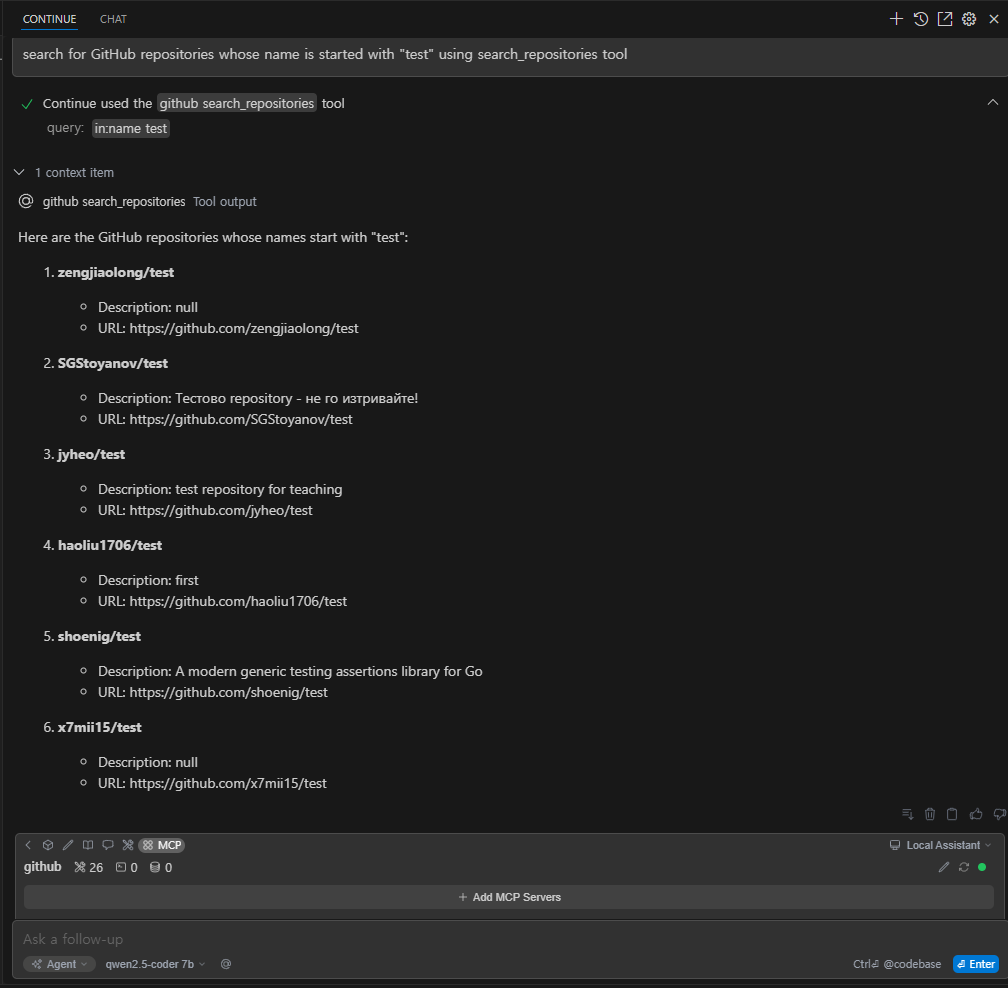 repository 목록을 가져오는데도 제가 사용한 qwen2.5-coder 7b 은 엄청나게 성능이 좋지는 않았습니다.